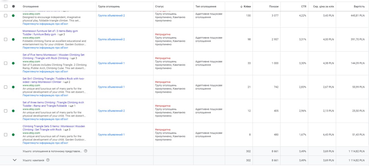 On the other hand, only one campaign for each of the selected countries (Western Europe) was running at the same time. No internal Etsy advertising was used.